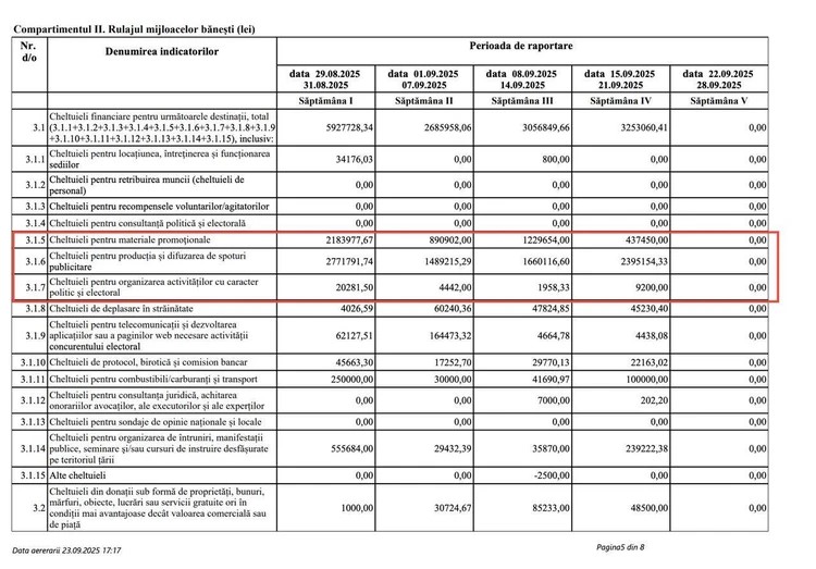 Согласно отчету, поданному в ЦИК, за первые четыре недели кампании партия потратила 14,9 млн леев.